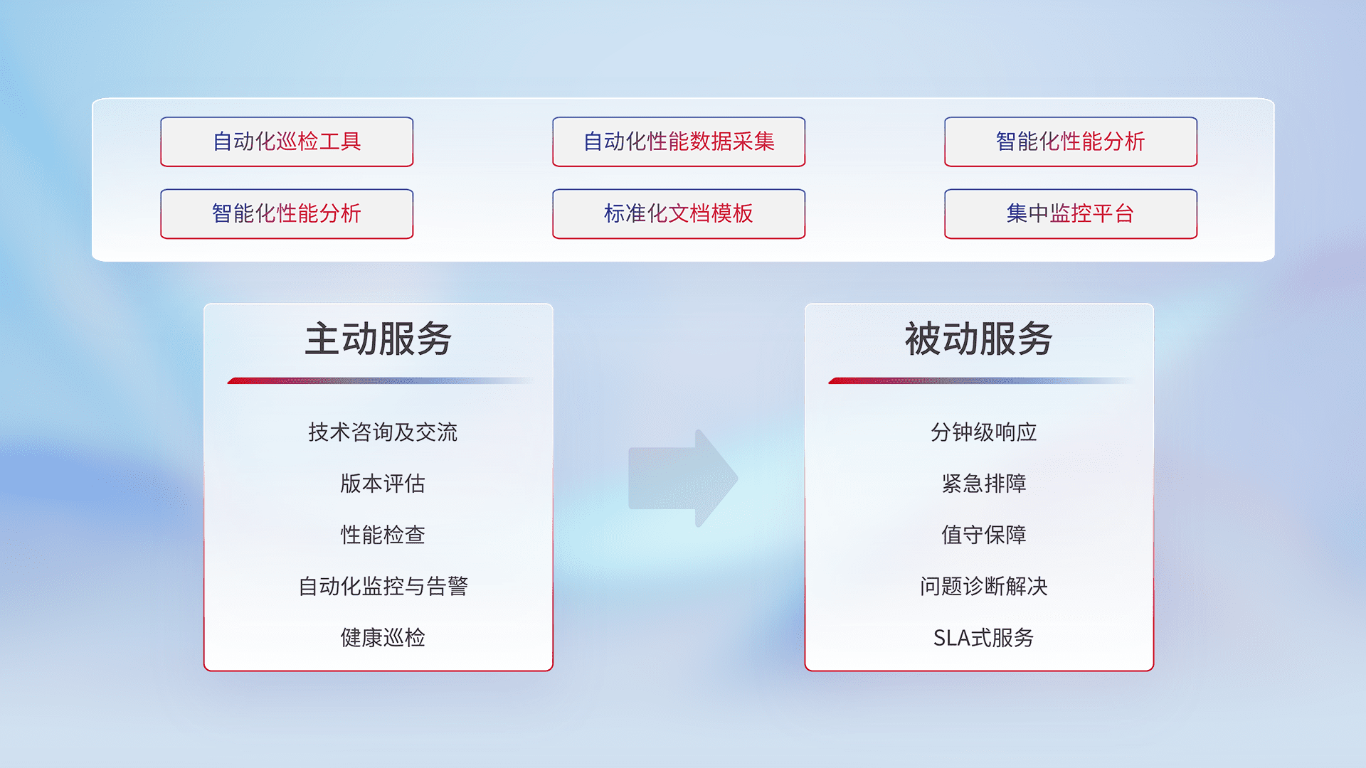 智能化工具和标准化文档,,保障服务质量,,提供主动服务(包含技术咨询、、、、版本评估、、性能检查、、自动化监控与告警、、、、健康巡检)和被动服务包含(分钟级响应、、、、紧急排障、、、、值守保障、、、、问题诊断解决、、、、SLA服务)。。。。